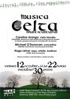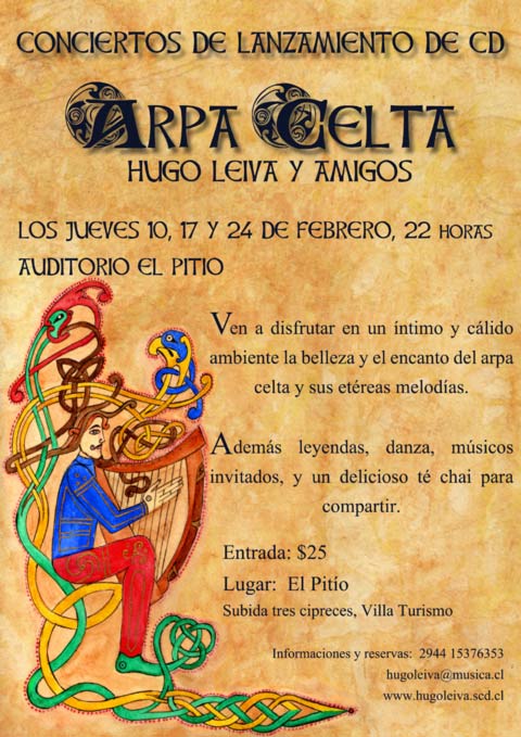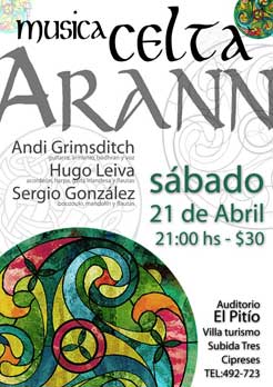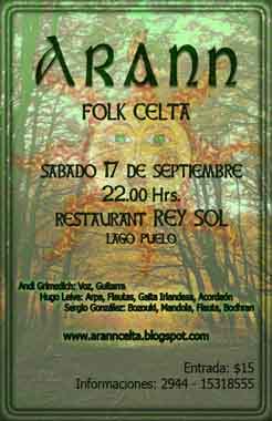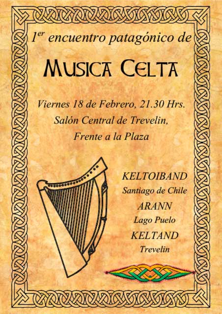 Se realizó el primer encuentro patagónico de música celta en Trevelin, en un hermoso teatro copado en su capacidad por un entusiasta público. Fue una linda oportunidad para pressentar mi trabajo de solista en arpa y del trío Arann. Además me reencontré con mis amigos de Keltoiband que estaban de paso por Argentina, y de verdad tocamos como si nos hubiésemos dejado de ver hace sólo una semana. Mis agradecimientos a Keltand, el grupo anfitrión, en especial a Marylin y Margarita.