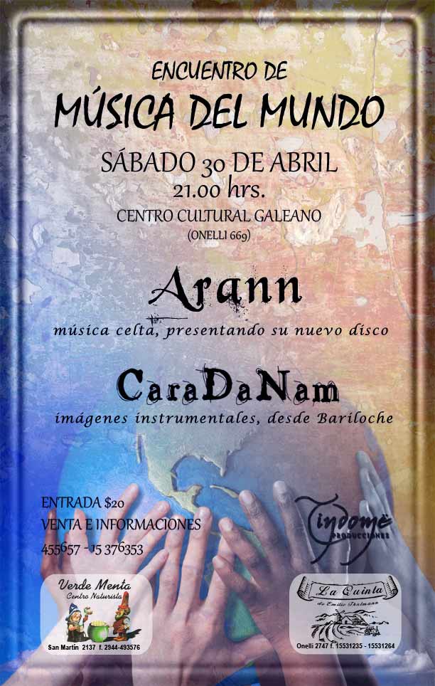 Primer Encuentro de Música del Mundo realizado en el Bolsón por Tindomë Producciones, participan Arann y Cara Danam. La idea es seguir realizando encuentros diversos de este tipo. Ya se realizó uno en Bariloche con éxito total de público, y la idea es lograr armar un festival un poco más grande.